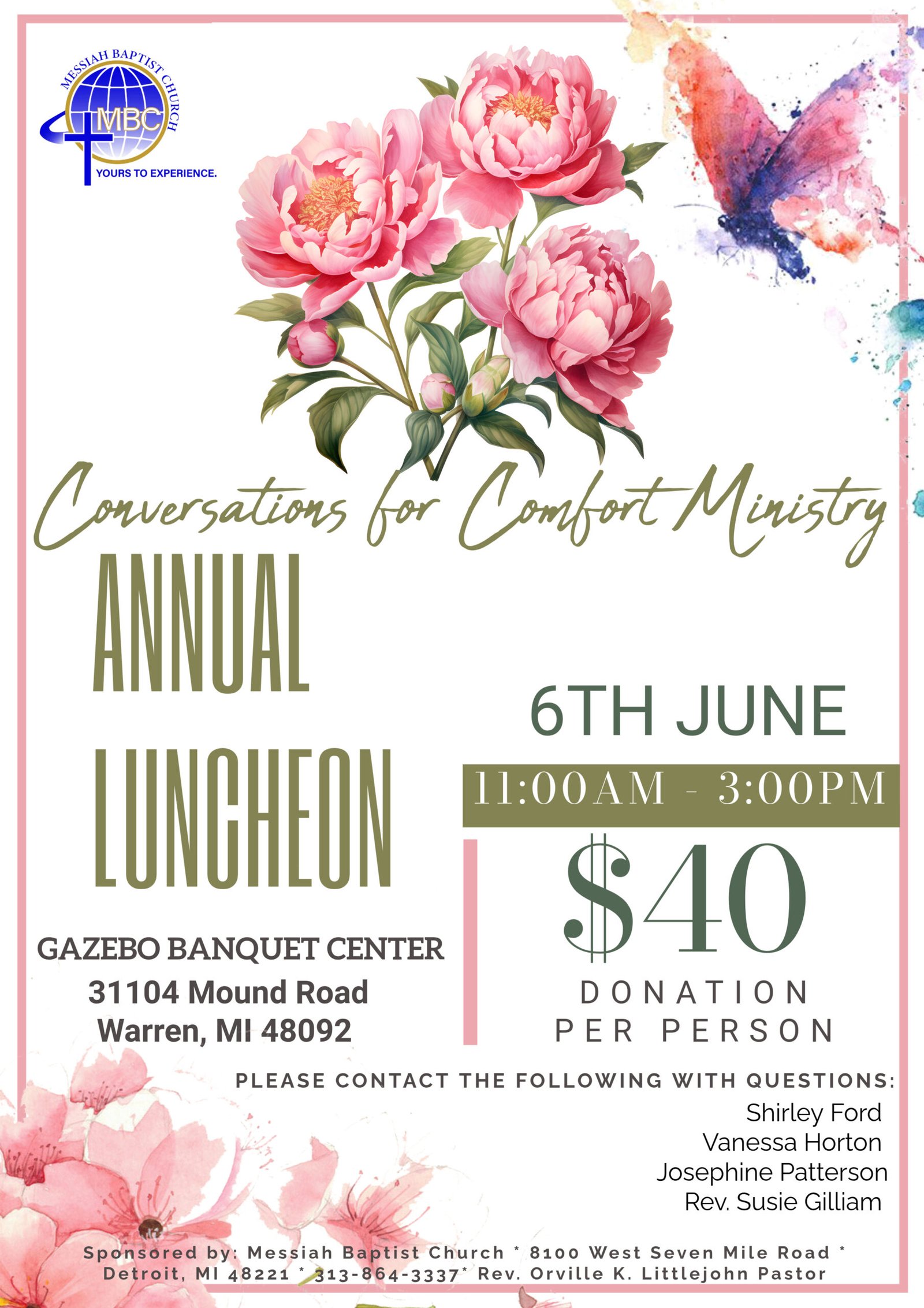Conversation of Comfort will host its annual luncheon on Saturday, June 6th from 11am - 3pm at The Gazebo located at 31104 Mount Road * Warren, MI. If you are interested in attending, please contact the church office at 313-864-3337.