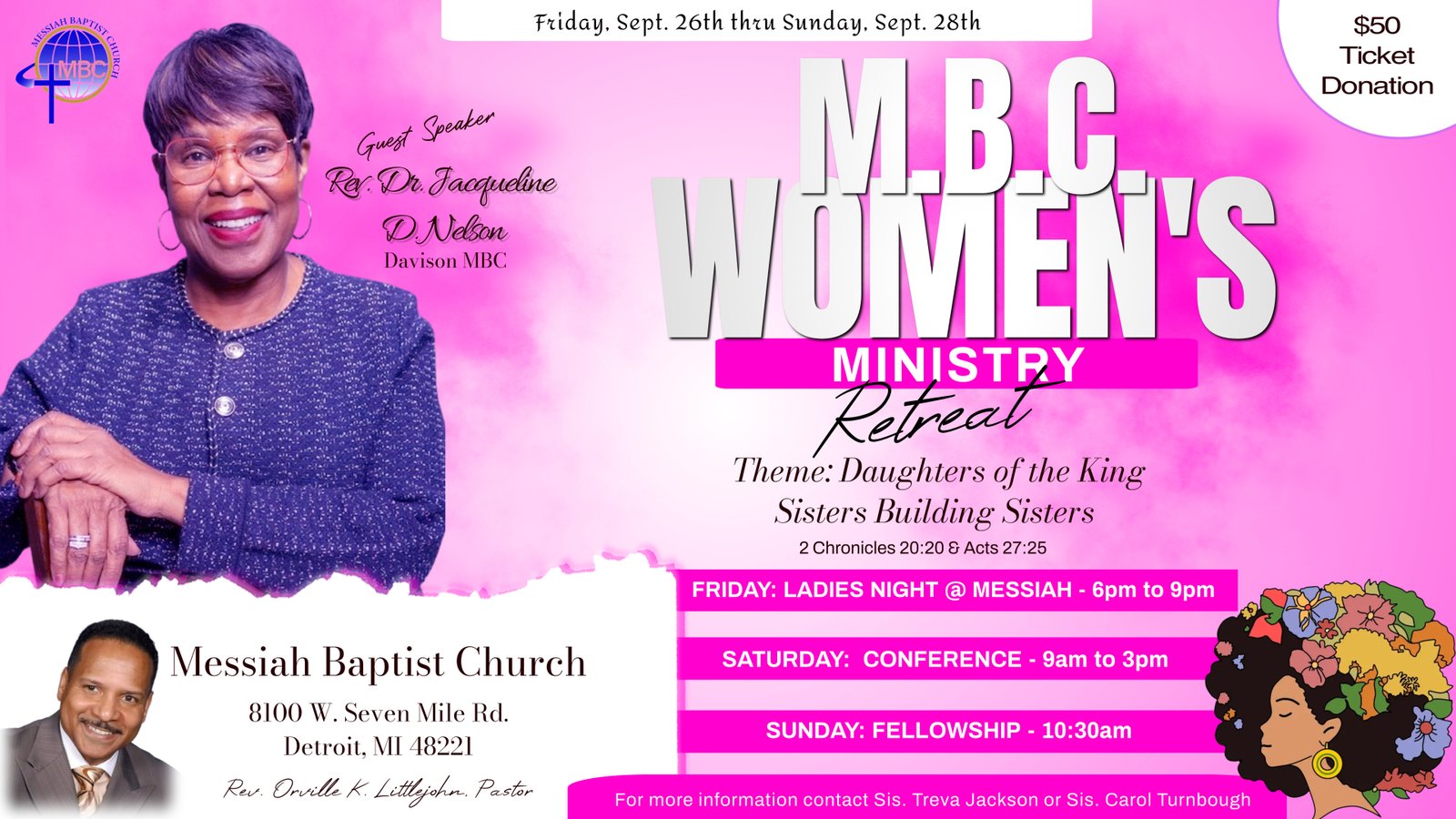 THEME: Daughters of the King - Sisters Building Sisters 2 Chronicles 20:20; Acts 27:25 Guest Speaker: Rev. Dr. Jacqueline D. Nelson - Davison Missionary Baptist Church Cost: $ 50 per ticket donation All women are welcome to attend. Note: MBC Church membership not required. |